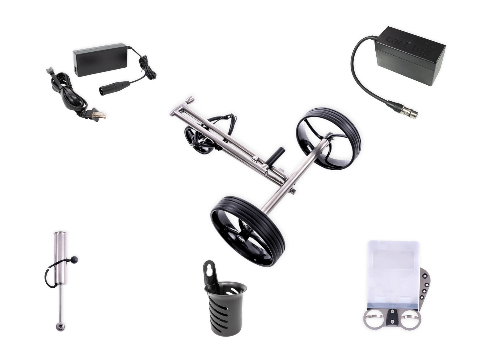Weighing in at only 16 pounds (7.25 kg) fully assembled (including the battery and accessories) Cart Tek brings you the stylish Galaxy Titan titanium golf caddy that sets the new standard in the best lightweight lithium-ion battery powered trolleys. With many years of experience selling lightweight electric golf trolleys, a new model has been created that combines style with new technology and reliability.